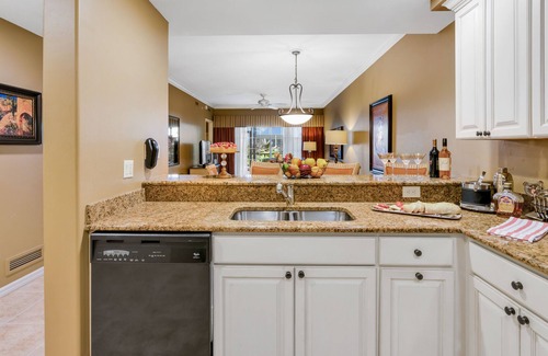 This single-story, ground-floor condo sleeps four guests comfortably in two suite-style bedrooms. Each has their own 32” flat-screen TV.