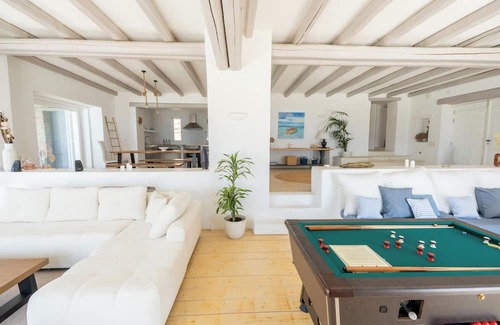 Inside, the villa boasts a fully equipped modern kitchen and a large dining area. The living room offers a comfortable, spacious sofa, a 60-inch flat-screen TV, and a high-quality sound system for entertainment. For added fun, there are two game tables where guests can enjoy friendly competitions.