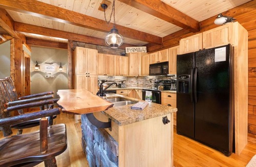 Here, within the heart of our log cabin retreat, you'll uncover the charm of granite countertops and a live-edge breakfast bar for two. The kitchen's open layout ensures that the chef never misses out as you create and share meals together. As you gather around the large kitchen table, seating seven, each meal becomes an opportunity to bond, share stories, and make lasting memories.
