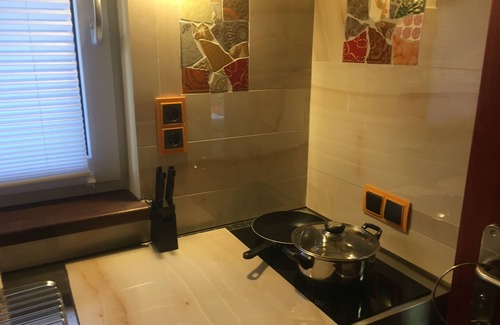 It is equipped with a fully equipped kitchen (oven, dishwasher, fridge with large freezer, double ceramic hob, kettle, etc.) with enough dishes and cookware to cook and eat for two.