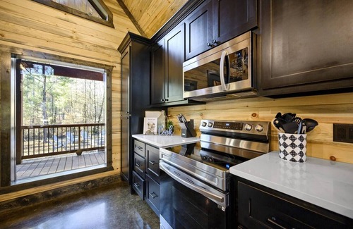 Walking up to the cabin you will take in the gorgeous wrapping deck with comfy spaces to enjoy your morning coffee or afternoon quiet time. When you enter the front of the cabin, you are welcomed by warm wood and open spaces, incredible light, and comfortable places to settle in and relax. The great room has spectacular floor-to-ceiling windows which bring the outside in, as you enjoy views of nature and the mature pine forest that surrounds. Get cozy watching a movie on the 55" mounted TV or just enjoy watching the gas-lit fireplace flicker below as you start to unwind in this perfect escape.