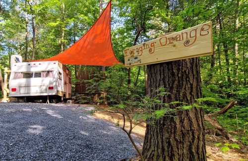 Stay in our Foraging Orange 60s vintage camper and enjoy the sounds of nature and feel the tranquility. Your site comes with its own fire pit, outdoor camping shower, and a 10 acre forest to frolic!
