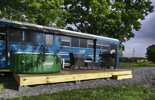 Escape to the tranquility of our converted school bus, nestled on a beautiful 40-acre farm near Charles Town and Harpers Ferry. Immerse yourself in the serene countryside with our resident horses and goats. This charming accommodation combines the novelty of a converted bus with the rustic charm of a farm. This bus features a cozy interior seamlessly blending comfort and character. Relax on the deck, enjoy meals in the full kitchen, take a dip in the hot tub and enjoy nights at the fire pit.