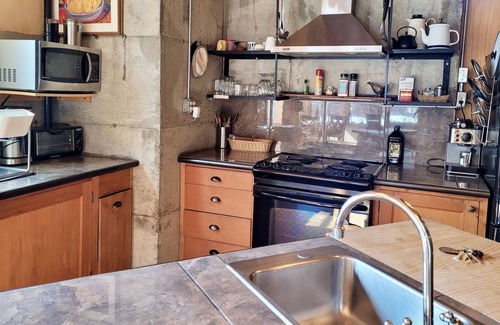 The bedrooms have queen beds, with additional sleeping on a twin/full bunk bed. The main-floor master has it's own bath, and outside entrance overlooking the river. Full kitchen, internet, unique wood stove, heated floors, patio with picnic table and small propane grill.
