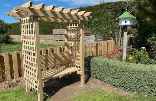 Grassmere Orchard by Tiny Away is located on the northern side of the apple orchard, offering convenient access to the veggie garden. This pet-friendly accommodation is nestled near a sunlit orchard surrounded by lush gardens, providing a comfortable and welcoming retreat for you and your pets.