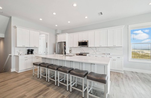 Take the stairs or elevator to the second floor and heart of the home, where a spacious and open great room exudes coastal warmth and charm. Gather around the L-shaped sectional, perfectly positioned for movie nights and entertainment, or enjoy more intimate conversations in the quaint sitting area behind the couch. A sleek gourmet kitchen with high-end appliances, granite countertops, and a spacious island that seats 6 opens onto a traditional 8-person dining table with great natural light. Admire breathtaking beachfront views and unwind on the expansive outdoor deck, with ample outdoor seating for lounging.