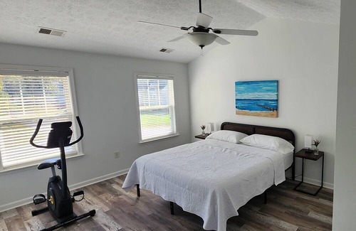 Inside the house you can enjoy of a lot of commodities: On the upper level you will find a master bedroom with a king size bed, a private bathroom and bathtub and a stationary bike; 1 shared full bath room; a second bedroom with a Queen bed and walking closet; a third bedroom with a full size bed and a twin size bed; and the fourth bedroom with 2 Twin XL size beds.