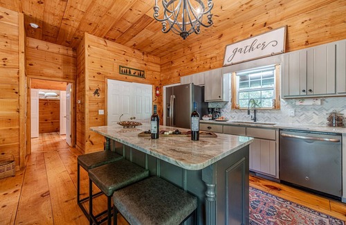 Hoo's There Hideaway is set up with a beautiful downstairs Master bedroom with a luscious king bed and a great ensuite with Jetted Jacuzzi Tub overlooking the outdoors the full bathroom has a spacious shower. The upstairs bedroom hosts two queen beds with a full bath upstairs and game room loft with FULL-SIZED POOL TABLE! BIG SCREEN SMART TV"S in Living Room, BOTH Bedrooms and Game Room with Rokus and high speed fiber internet for all your streaming and business needs. Large hot tub on the covered back porch with a beautiful seasonal mountain view and the manicured landscaping! A wood fireplace to snuggle up to in the living room while enjoying a cup of coffee and a fully stocked kitchen to have everything that you need to prepare a gourmet meal for your family! Also, enjoy the charcoal grill just off the back porch to grill up and smoke your favorite creations!