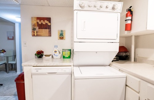 Our private 2 bedroom basement apartment of 850 sq ft, has been freshly renovated to create a stylish space and modern feel. You will have ample room to gather with family and friends to make memories you can cherish for a lifetime. In our large living room, accented by stunning art pieces, you will experience a light, airy ambience while you sink into our white leather sofas to relax with Netflix on our huge smart TV. Or curl up with a blanket while you read a good book in front of our cozy electric fireplace. In each of our tastefully decorated bedrooms, you’ll get a restful night of deep sleep on our luxurious King sized beds. We also have bedding for an additional 5th person to sleep on our sofa, and a good twin inflatable mattress for the 6th person. We have a complimentary washer, dryer, and dishwasher for your convenience with laundry soap and softener sheets.