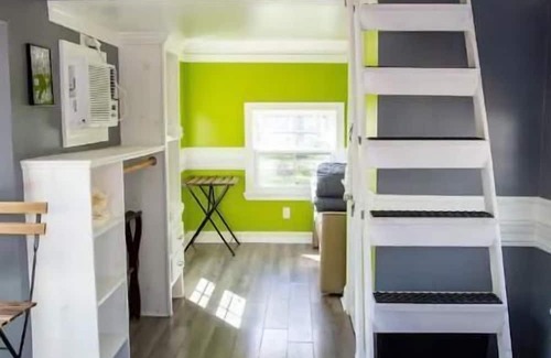 The tiny home is a converted RV. There is a kitchen area with a stove, refrigerator, small convection oven and microwave. There movable tables/trays for dining. The bathroom has a toilet, shower and sink. There is a full size bed in a loft and a queen size futon. It can comfortably sleep 3 people. Pets are allowed for a $50 non-refundable fee. Pets must be kenneled if left inside alone and on a leash at all times when outside.