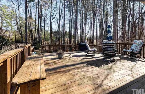 "Enjoy a stylish experience at this home retreated in the woods on a 1.2 acre lot.. RTP, Duke, UNC, NC State, Apex, Durham, Chapel Hill, RDU Airport all within 20 min drive. 2 miles from restaurants, markets including H-Mart, Harris Teeters, Wegman’s and shopping. Jet tub, huge shower , one king bed and 2 queen beds with a daybed in bonus big sunroom can be the fourth sleeping place needed. Well-equipped kitchen, brand new Maytag washer/dryer. Super speed fiber WIFI, smart TVs in all bedrooms, Coffee, tea, in sink hot water always available. all fenced backyard with huge beautiful deck.