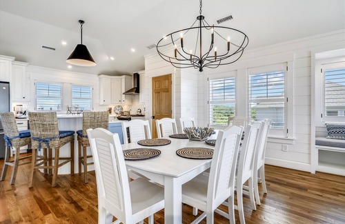 Unleash your inner chef in Knot for Sail's immaculate kitchen, where modern design seamlessly blends with functional elegance. Bright, white cabinetry contrasts beautifully with the gentle blue tones of the island, while the luxurious marble countertops gleam under the soft overhead lights. Every detail, from the honeycomb tile backsplash to the state-of-the-art appliances, has been curated for those who delight in culinary endeavors. Large windows flood the space with natural sunlight, making meal preparation a joy, and the charming nautical touches remind you that the ocean's bounty is just steps away. Here, every meal becomes a memorable experience, surrounded by tasteful decor and the promise of seaside adventures.
