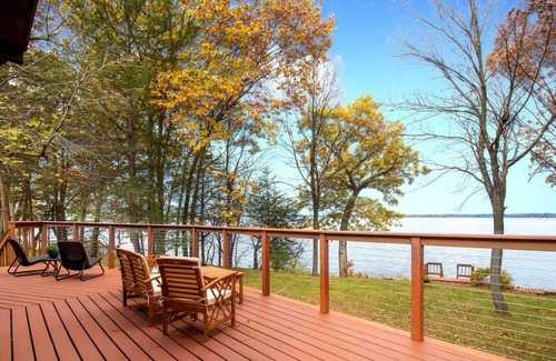 OUTDOOR LIVING: Oversized wraparound deck, gas grill (propane provided), fire pit, open yard, 100-ft lakefront, pier (available Memorial Day-Labor Day), bicycles, kayak, canoe