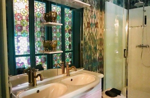 Very beautiful 22m2 suite, located on the first floor accessible by stairs, equipped with a 160 x 200 bed, decorated with a colored fresco of 11 m representing an exotic garden (Publisher: Anambo). Behind 2 stained glass windows, hides the bathroom with shower, double sink and hanging toilet. Flat screen in the bedroom.