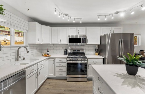 The fully stocked kitchen includes a refrigerator, stove, oven, microwave, dishwasher, and coffee maker, as well as cooking basics, bakeware, and dishware. Whether preparing breakfast before a hike or sitting down for dinner, everything you need is close at hand.