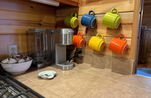 The quaint dining nook features a rustic handmade antique oak dining table. Savor home cooked meals on the bright and colorful collection of genuine Fiestaware and enjoy your favorite beverage in a glass from the well stocked cabinet of glassware. There are even champagne flutes for those extra special celebrations!