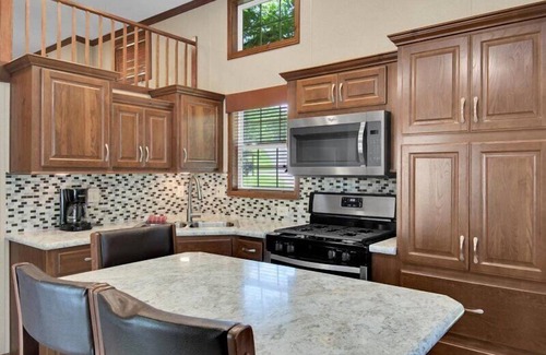 This park model home boasts a single bedroom furnished with a queen-size bed, ensuring comfort with its cozy mattresses and provided air conditioning for a peaceful night's rest. The cabin comfortably accommodates 5 guests, it also features a cute little loft, perfect for the kids to "camp out" on air mattresses.