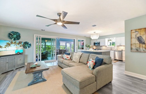 Paradise awaits in the Lower Keys! Situated on a large corner lot, you have over 200 feet of concrete dockage so BIG BOATS are welcome! Featured on " American Dream Home," this vacation home will not disapoint. Whether you're looking to fish the Atlantic or Gulf, snorkel at Looe Key Reef, or just enjoy paradise, you're a short boat ride away with no bridges to worry about to open water. Located 30 minutes to Key West or 20 minutes to Marathon by car! There is fish cleaning station, and a corner step down for swimming or kayak launching into the deep, flow-through canal, this property is a water enthusiast's dream! This home has been completely renovated and features a large, HEATED pool with privacy from your neighbors along with an outdoor covered bar that overlooks the canal complete with a grill & fridge. You will really feel like you're in paradise when the landscape lighting illuminates all the palm trees at night! Interior features include a 1 level, open floor plan, with huge kitchen, island large enough for 4 bar stools, pantry, spacious living room with sectional couch that makes into a pull out bed, Lanai with a dining table to seat 6, washer/ dryer closet, and additional living room with another pull-out sofa! There are 2 bedrooms in the main house, each complete with a private bathroom and double closets! The 3rd bedroom and bathroom are detached from the home by a breezeway which is perfect for short term visitors! This home sits on an oversized 10,575 sq ft lot with tons of parking for cars, vehicles, trailers or even an RV. Enjoy sunsets over the salt ponds, or bring your bicycle for a ride around beautiful Jolly Roger Estates! Little Torch Key is conveniently located over the bridge from Big Pine where you can enjoy the conveniences of groceries, shopping, bait/tackle shops, delicious restaurants, and those adorable little Key Deer!