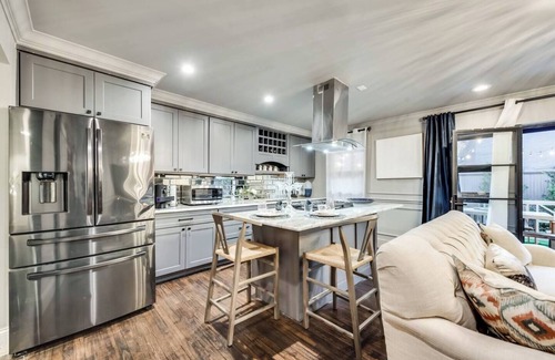 Experience refined living in a beautifully appointed one-bedroom residence on historic Swiss Avenue. This elegant retreat features a plush King bed with premium linens, high-speed Wi-Fi, and a stylish living area with a 65″ smart TV for relaxing evenings. A fully equipped modern kitchen makes in-home dining effortless, while large windows fill the space with natural light and offer peaceful views of the gated courtyard. Set in the heart of Dallas, you’re moments from top dining, boutique shopping, vibrant arts venues, and cultural attractions.
