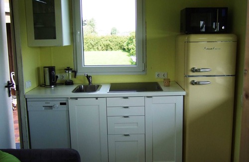 Equipment: Bedroom: double bed, very good mattresses, large TV Bathroom: large shower, mirror cabinet, hair dryer Living area with perfectly equipped kitchen: induction stove, kettle, microwave, coffee maker, dishwasher, fridge and freezer, toaster, pots and pans, dishes, various Spices Own covered terrace in the garden: bench, table and chairs, barbecue Other: W-LAN, infrared heating (cuddly warmth within a short time), washing machine, very good bikes for rent
