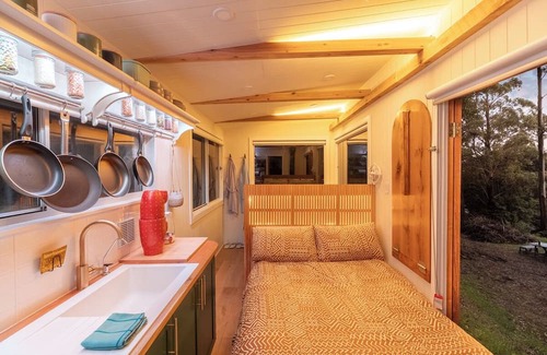 Architecturally designed, the cabin boasts a unique feature – no lofts. With bright warm timber interiors, it aims to provide a grounded retreat from the harsh Australian sun. The absence of a bedroom loft allows for a spacious feel and a better tiny house experience.