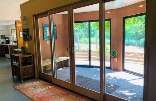 The Grapevine Hideaway is a private, Mediterranean style mini villa. Enjoy a quiet wooded retreat in this unique solar passive home with a fenced in yard and a beautiful garden area. Luscious grapevines decorate the home with delicious beauty. This pet friendly home has three bedrooms, one bathroom, a spacious living room, and a kitchen that is well stocked to fill your needs. Great place for family and friends!