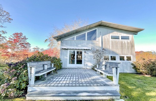 This midcentury modern house is an art-lover's dream! Beautiful two-story house, secluded, built by famous modernist painter within walking distance to the beach. Enjoy the gorgeous and peaceful New England countryside in a sophisticated, comfortable space. Outdoor spaces abound with a huge open yard, gazebo, patios, a roof terrace, fire pit, hammock, and small pond. Inside, enjoy midcentury design, beautiful art, towering ceilings, fireplace, sauna, lots of natural light, and full amenities.