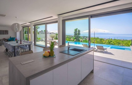 Matulji: Modern villa "Minimal", 2 storeys, built in 2018. In the hamlet Spinčići 1.5 km from the centre of Matulji, 6 km from the centre of Opatija, in a quiet, sunny, elevated position, 4 km from the sea, 4 km from the beach, in a cul-de-sac, in the countryside. Private: property 1'300 m2 (fenced), swimming pool angular, heated (10 x 4 m, depth 150 cm, seasonal availability: 01.Apr. - 30.Oct.) with internal staircase. Outdoor shower, table tennis, basketball, terrace (130 m2), barbecue. In the house: internet access, sauna, hot tub, billiard table, air conditioning, washing machine. Parking (for 3 cars) at the house on the premises. Shop 350 m, restaurant 1 km, bus stop 350 m, pebble beach 4 km, concrete beach 4 km. Groups of teenagers on request only. Neighbourhood highly sensitive to noise. Quietness and good behaviour expected. Swimming pool with hydromassage. Swimming pool heated (extra). Organizing a party is not allowed.