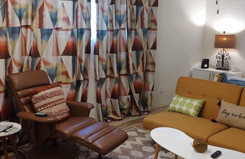 The Mirage is a little hotel style studio apartment tucked behind the main house. It has a private exterior entrance of its own, so you check in without any contact with the host and will have no one in your interior private space, but the yard is shared and the structure of the home is shared ( like the roof, and one wall.) There IS a door inside the apartment that leads into the main house- that door is always kept locked and is lockable from both sides. The apartment has a king size bed, ceiling fan, and mini-split AC/heat. The "living area" has a small double size futon, a massage chair, and a tv with roku and streaming services, as well as a little dining table and chairs. There is a simple kitchenette with a 2 burner-stovetop, mini-fridge, sink, coffee maker, and toaster oven/air fryer combo. Heading into the ensuite bathroom there are two large closets, a huge spa shower with multiple showerheads, and double sinks. There is wifi as well.