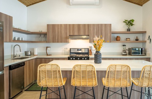The interior of this home offers the perfect blend of modernity and rustic charm with natural accents here and there. Come in from a refreshing dip in the pool and spread out comfortably on the large sectional. Enjoy smarter technology like TVs with all your favorite entertainment apps available, wifi throughout, A/C units in every room, and the indoor/outdoor bluetooth sound system while the house's eco-friendly solar panels help to offset your carbon footprint (pura vida!). When mealtime comes, the fully-equipped open kitchen features all stainless steel appliances that will make cooking and entertaining a breeze. You can blend up smoothies for the whole family with the local produce from the Saturday Tamarindo farmer's market (don't miss the local guanábana and maracuyá!) and dine either at the kitchen island or alfresco on the outdoor, locally made Guanacaste wood dining table under the covered patio.