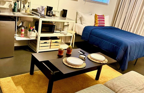 Private studio with rain shower, in-unit washer/dryer (detergent included), Smart TV w/ Roku & Netflix, and a stocked coffee bar with coffee, sugar, and creamer. Mini kitchen includes microwave, fridge, dishes, utensils & seasonings. Queen bed, comfy sofa, cold A/C, and fast Wi-Fi. Private entrance in a quiet, safe neighborhood. Ideal for remote work, long stays, or short getaways. Clean, functional, and easy to settle into. Plenty of parking.