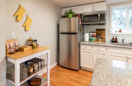 Brand new appliances, including a full-sized refrigerator, stove, oven, dishwasher, and microwave. Coffee is provided from Joshua Tree Coffee Company, along with a coffee grinder, drip coffee maker, French Press, tea, kettle, pots/pans, baking sheet, Brita water filter, ice cube trays, knives, cutting board, corkscrew/bottle opener and various other cooking utensils. Plates, bowls, glasses, mugs, stainless wine cups, and eating utensils are all provided.