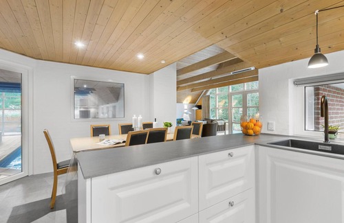 In the beautiful forest of Mosevrå is this beautiful cottage with playroom, swimming pool, whirlpool and sauna. There is also a large kitchen, it is open to the living room. In the living room there is the fireplace and exit to the terrace to the southwest. The game room on the 1st floor houses table soccer, air field hockey and PlayStation2. On the property are available beach volleyball court, trampolining, swings and sandbox. The popular beaches of Blåvand and Vejers are about 15 minutes drive away by car. You can also enjoy cycling and hiking in this varied landscape. A bike path goes all the way to Blåvand, which is known for its white swimming beach. Good shopping can be done in Vejers Strand, in some areas you can drive onto the beach.