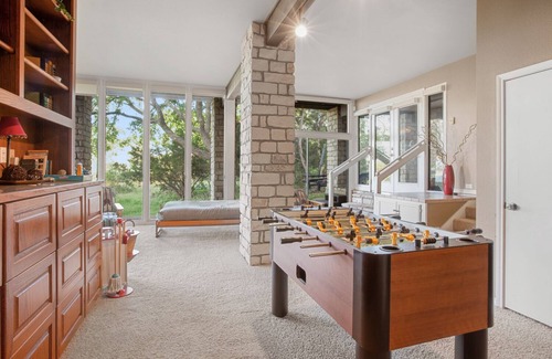 This waterfront custom home with boat dock has a wonderful open floor plan and is elegantly furnished. Spectacular 180 degree views of Lake Travis and the Texas Hill Country! Conveniently located just 35 minutes to downtown Austin. This spacious 4400 sq ft home can sleep 12 -16 and is perfect for large families! The upper level has a large gourmet kitchen that opens to two dining areas, a living area with fireplace, walls of windows & lakeside deck, a den area with comfortable leather seating and 65 in HD TV, 3 bedrooms & 4 full bathrooms. Large game room area w. poker/card table, foosball table, & a lake view sitting area with plenty of room for the Deluxe Queen Aero bed. It also features a separate media room with leather seating, and 55 inch Roku.
