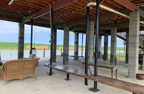 where we have 1,500 Sq Ft of space available with chairs, BBQ grill and boiling pots for those crabs you caught off the peer (crab traps available for your use). We have a large dock for your boat and fishing as well as chaise lounge chairs to enjoy while watching the fish jump and other wildlife in the water.