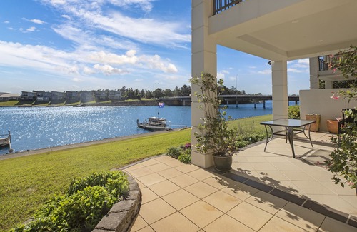 The sleek contemporary kitchen comes equipped with quality appliances, including a dishwasher and microwave, flowing into a spacious dining area and a beautiful sunken lounge. Take in stunning canal views from both the main bedroom and the living area.