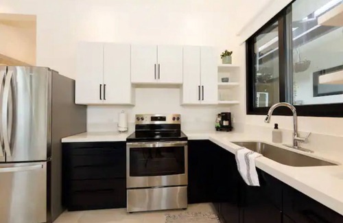 The bedrooms feature Queen size - Cool Max Gel - Memory Foam beds, Samsung smart TVs and AC in each room, one room has a security safe for valuables and the other has a local Teak wood desk for a quiet workspace. The bathroom features a large walk-in tile shower, double sink, and washer dryer combo unit for laundry.