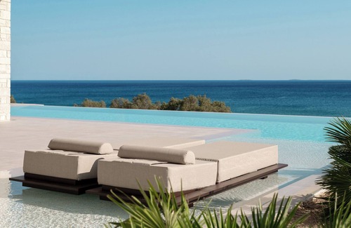 Discover the epitome of luxury living at Villa Aretousa, perched majestically on the cliffs overlooking the azure waters of the Libyan Sea. From its striking stone and wood exterior to its expansive pool area surrounded by ancient olive trees, this villa offers a retreat like no other.