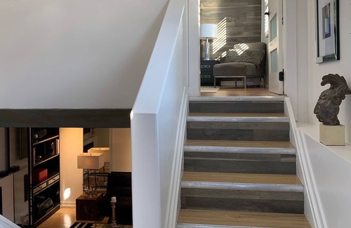 The Coach House Loft offers two levels of beautiful modern decor plus all the amenities of a full private apartment — two story vaulted private entry with exposed beams, sweet sunken living room with fireplace and wine cooler, powder room, in suite laundry, eat-in galley kitchen with granite counter tops and state of the art appliances. Upstairs there’s a large bedroom, big king size bed and en suite bathroom. Basics include heat, air conditioning, laminate floors, laptop-friendly workspace, wireless printer, complimentary WIFI and cable TV. Coffee, tea and sugar are on the house. So are shampoo, bodywash, hair dryer, hangars, extra towels, linen, pillows and blankets. Anything else you need is just a text away.