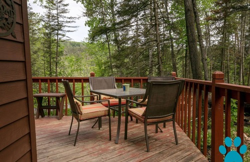 Cabin features open floor plan with cozy living room, wood burning fireplace, TV & Wi-Fi. Open to small kitchen with stove top, microwave & amenities needed to cook. Couch pulls out into full size bed. Private bedroom with balcony overlooking woods. Wrap around deck offers shaded area to lounge or grill out.