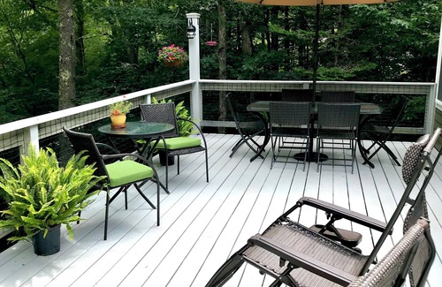 A perfect blend of privacy in a natural wooded setting on pristine Coffee Pond, yet close to the many attractions of Maine’s lakes region. Trek down the moderate handrailed path for great swimming, kayaking, fishing and lounging right off of our private dock with crystal clear water and a cleared gravel/sandy bottom. Swim to the private floating dock for sunbathing or just sit back and relax on the expansive deck overlooking the water and listen to the loons. Two adult kayaks, two youth kayaks and canoe are available to tour the mile long, spring fed pond from our dock.
