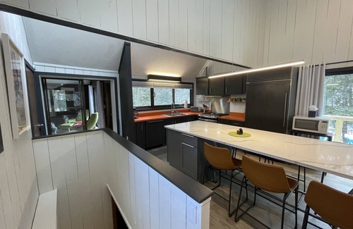 This space is complemented by a remote control gas fireplace, ceiling fan, slider to the rear deck and high ceilings. Perfectly suited to get you rested for every kind of adventure you seek, and all the needed comforts to help you melt into the night after a day in the mountains or in the river.