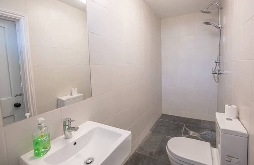 Wet room with walk-in shower, double-headed shower head, WC and wash basin