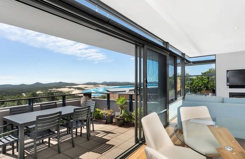 Nestled high above the pristine and popular One Mile Beach, this stunning single-level coastal apartment has incredible views of the coastline and surrounding national park, whilst basking in complete privacy. Situated in the exclusive gated One Mile Ridge complex, the property has been architecturally designed to maximise its panoramic outlook and every inch of the property has been maximised for your enjoyment, this holiday home is a luxury coastal escape for the whole family to enjoy.