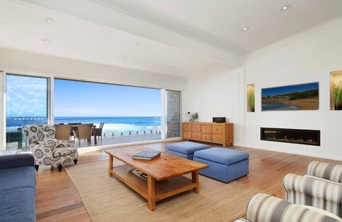 Imagine floating in a boat on the water as you look across the ocean's horizon at Seaboard. This stunning beachfront house is the perfect place to sit back and breathe easy. Set on three spacious levels with breath taking panoramic ocean views visible from all levels, Seaboard at Forresters Beach is a superb option for those who wish to be close to the beach without compromising on style. From its freshly painted walls to the stylish rustic floorboards in its living spaces, this beach house has undergone a massive facelift to offer the ultimate relaxed ocean retreat. Themed with nautical blue and white touches throughout and wood panel walls, Seaboard offers a unique experience. With multiple indoor/outdoor living spaces, there is plenty of space for adults and children to enjoy their holiday. Seaboard is a short drive to Bateau Bay Square Shopping Centre, Terrigal and The Entrance. Master bedroom contains a king bed, private balcony, en suite with bathtub and shower and views. Bedroom 2 contains king split bed and private balcony. Bedroom 3 contains a double bed, en suite with shower, private balcony and views. Bedroom 4 contains queen split bed, whilst bedroom 5 contains two single beds. Bedrooms all contain built-ins, oil heaters and wool doonas for cold wintery nights.