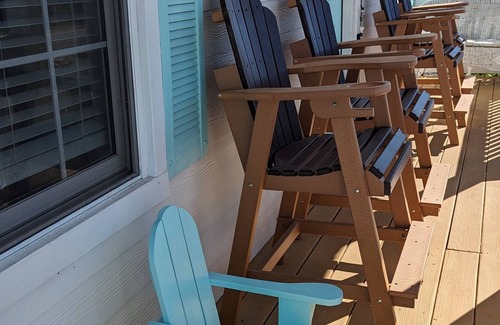 9 beach chairs/recliners in storage box, 2 carts, 3 umbrellas and a 2 person sea kayak with wheels /vests supplied along with air pump, boats OK; sleeps up to 9 (max 6 adults) - guest room upstairs has twin over queen bunk beds, master bedroom upstairs has a king bed, queen sleeper sofa in living room, and futon queen bed (new mattresses Nov 2021) in downstairs 3rd bedroom; updated kitchen and lots of extras plus 5 TVs - 1 block/3 minute walk to beach. All TV service is Internet streaming with free Netflix, YouTube TV, Prime Video, MLB, etc. There is a Ring doorbell at the front door so if you have any issues getting in you can contact us directly from there. Upgraded outside with wooden deck table & chairs plus bench and nicer chair cushions, changed bar countertops to quartz, upgraded barstools and added a full cabinet with drawers for sink (hot & cold water) - wonderful outdoor covered entertaining area with 43" smart TV - Weber gas grill plus a small charcoal grill so you can choose! Keurig K-cup coffee brewer along with drip coffee maker for ground coffee and a coffee grinder, Nespresso cappuccino-espresso machine; makeup mirrors in both bathrooms, smoke and CO2 detectors in all rooms. Outdoor chair cushions for new Adirondack chairs Mar 2024 in fire pit area now kept in storage boxes by swing plus storage area on left side of bungalow by bikes (for weather protection).