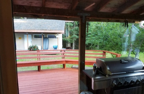 Off the family room you can enjoy a large deck (16' x 40') with a BBQ under a covered area. That way you can BBQ rain or shine. There is hot tub at the end of the deck, but unfortunately it is currently not functional. Hope to have it working, or replaced, by next summer. We have a large open yard that is surrounded by trees and views of Mt. McGinnis. Mt. McGinnis borders the left side of the Mendenhall Glacier.