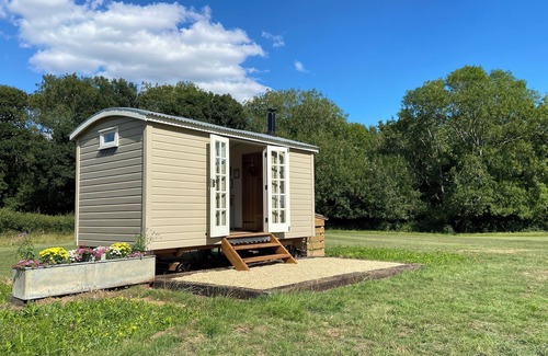 Shepherd Hut 2 is a single-storey property with a studio-style layout featuring a double bunk (double above, double below), kitchen, and dining area. The shower room includes a gas-powered walk-in shower, basin, and compost WC. The kitchen is equipped with a gas hob, fridge, and kettle. The hut also has a TV and board games. Bed linen, towels, fuel, power, and a starter pack for the woodburning stove are included in the rent, with additional wood available on-site for 5GBP per bucket. Free off-road parking is available, and there is an outdoor seating area with a fire pit/barbecue, picnic table, benches, and field shelter. One well-behaved dog is welcome, but smoking is not allowed. Please note that there are no 3-pin sockets within the huts, but two solar-powered USB points are available. There is no WiFi at the property. Although the hut is single-storey, there are steps up into it, and parking is a short walk from the hut as cars are not permitted on the field. Savour an off-grid break at Shepherd Hut 2.