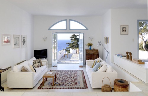 Architect designed, generously laid out home in exclusive setting overlooking the Aegean and Santorini, ideal for a relaxing holiday on the beautiful island of Ios. Well-appointed house with large open spaces waits for you! Bring your family or friends and enjoy sweeping vistas of beach, sea and sky in this ideally located villa. Close to beach and village, but secluded enough for privacy. Marble floors throughout, picture windows, comfortable furniture, terraces, whispering pines... Sky Villa beckons the discerning traveler!
