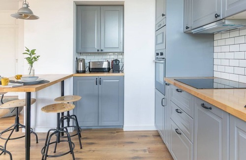 The fully equipped kitchen includes a stove, oven, microwave, fridge, kettle, and coffee maker, along with cookware, utensils, and wine glasses—everything you need to cook and dine at home. Meals can be enjoyed at the sleek island dining area, complete with bar stools, which also doubles as a convenient workspace.